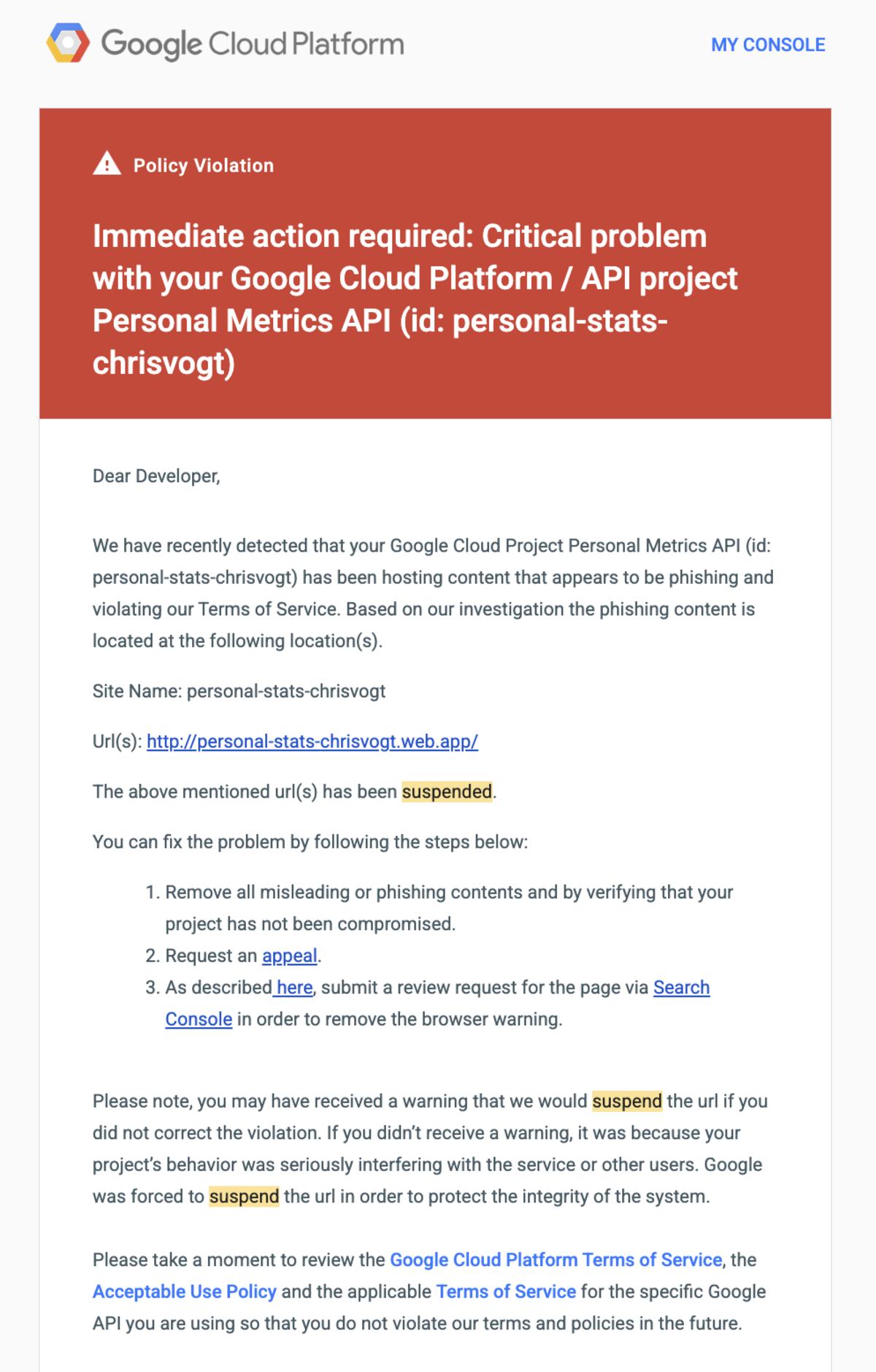 We have recently detected that your Google Cloud Project Personal Metrics API (id: personal-stats-chrisvogt) has been hosting content that appears to be phishing and violating our Terms of Service. Based on our investigation the phishing content is located at the following location(s).