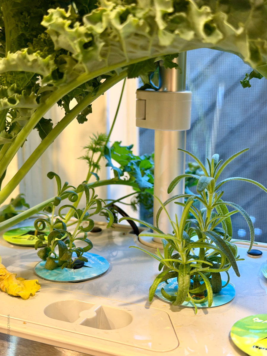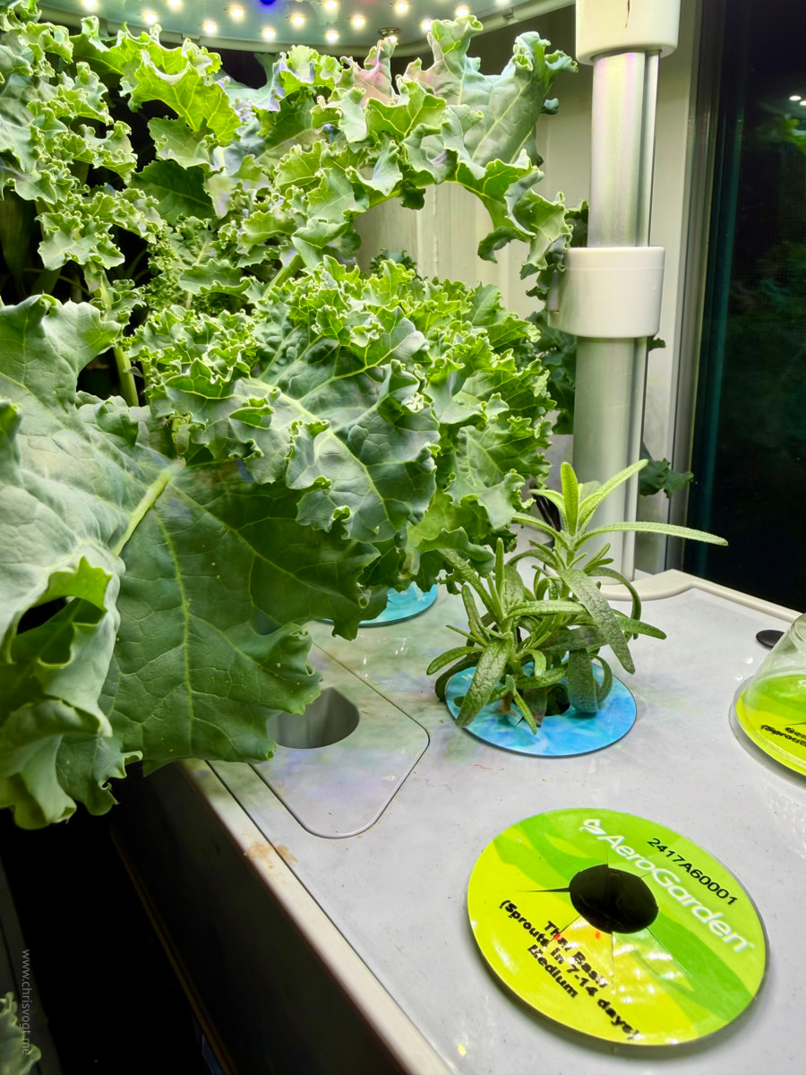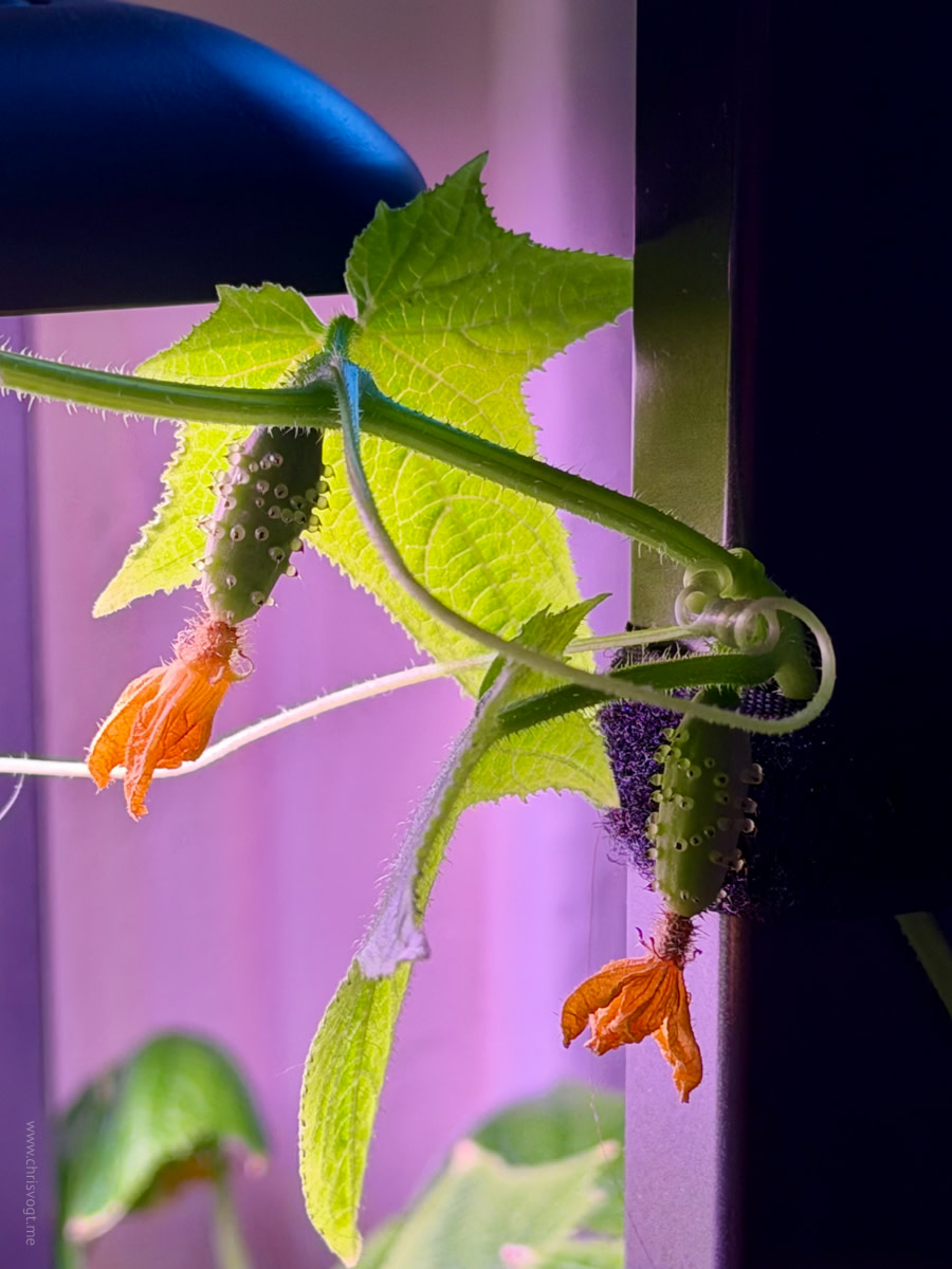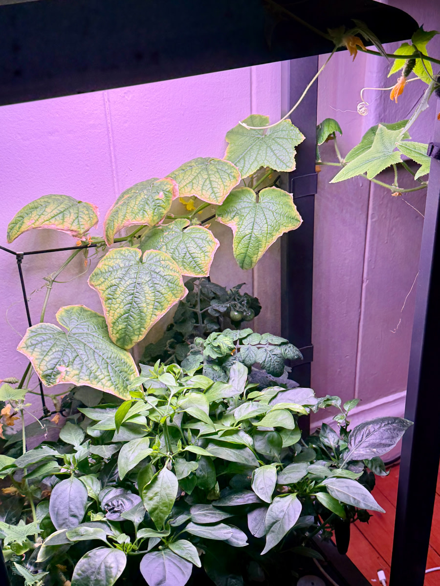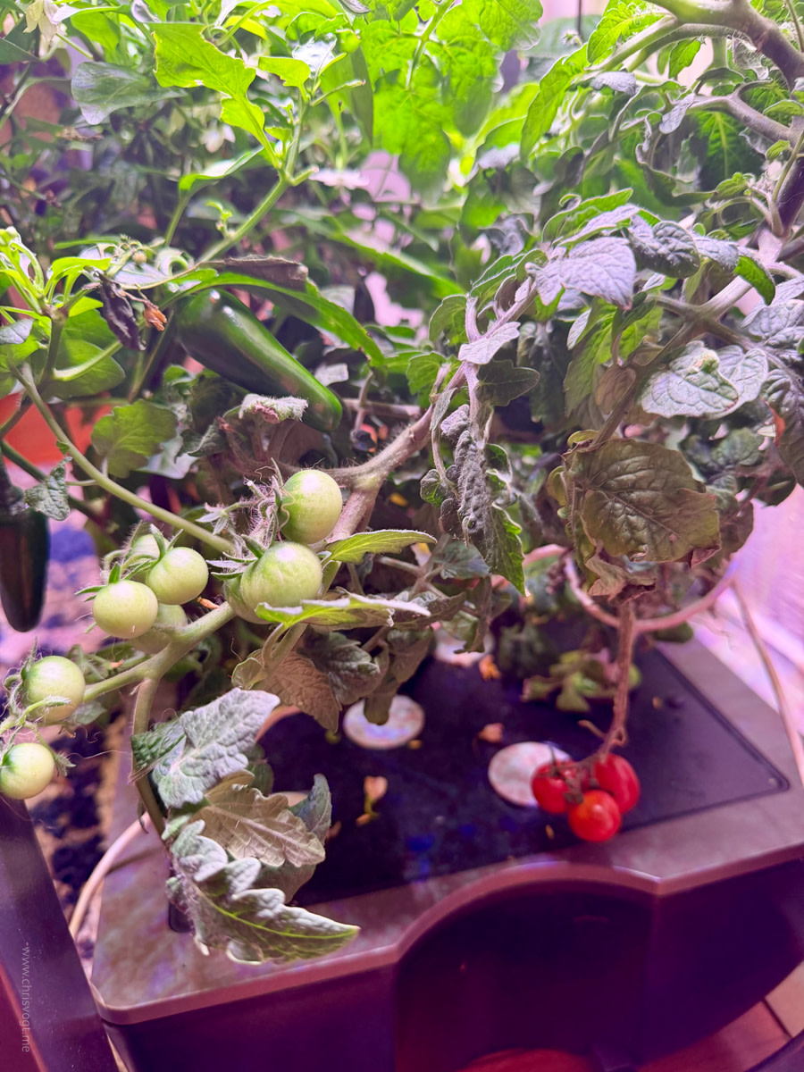 My indoor AeroGardens are continuing to thrive, with jalapeños and cherry tomatoes ripening, the cucumber vine growing up and out of the tall indoor garden, and rosemary and greens doing well in the kitchen. There's an issue with the lower part of the cucumber plant — the leaves are turning brown and dying — but so far I haven't been able to pinpoint the cause. If you search online for "cucumber leaves turning brown," there are way too many possible reasons to narrow it down.