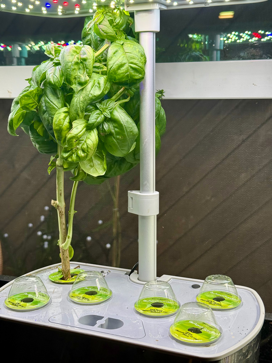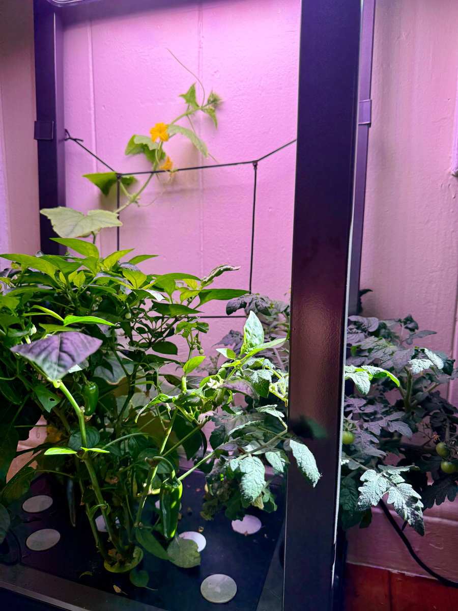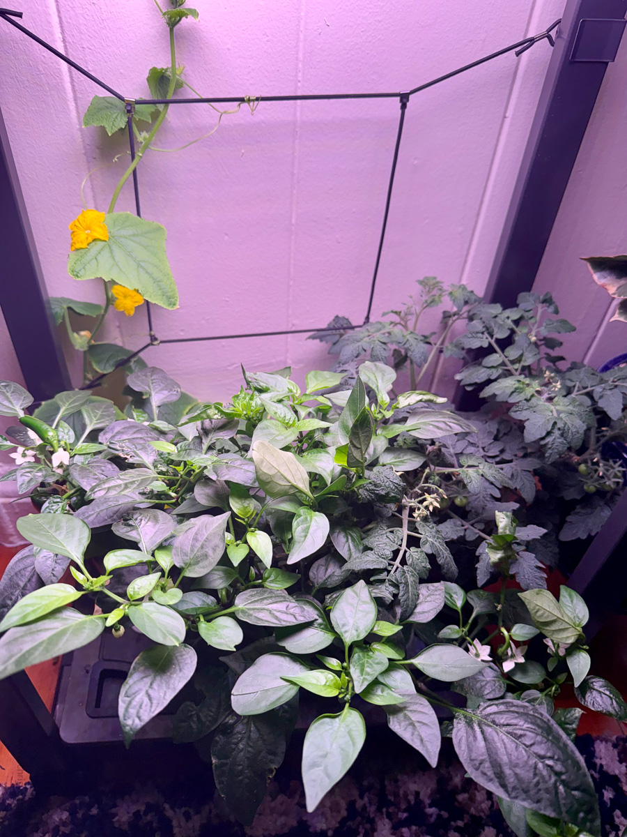 I've become quite absorbed in indoor gardening this month. Three countertop Aerogardens now run indoors, plus a larger floor model where I'm cultivating cucumbers, jalapeños, and cherry tomatoes. The cucumber plant grows with remarkable speed, its vines reaching toward light sources in ways that feel almost intentional—watching it adapt and stretch toward illumination has been unexpectedly compelling.